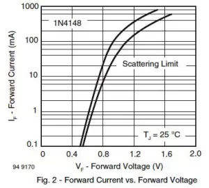 پیش از خرید دیود حتماً باید تمام دادههای موجود در نمودار فوق را از دیتاشیت دیود مطالعه کنید و با طراحی مدار خود تطبیق دهید. در بعضی از دیتاشیت ها قسمت بایاس مستقیم را با جزئیات و دقت بیشتری ارائه میکنند که در تصویر بعد مشاهده میفرمایید. در این نمودار شما میتوانید حداکثر جریان مجاز دیود در حالت بایاس مستقیم را ببینید.
